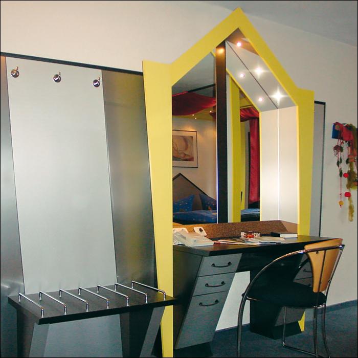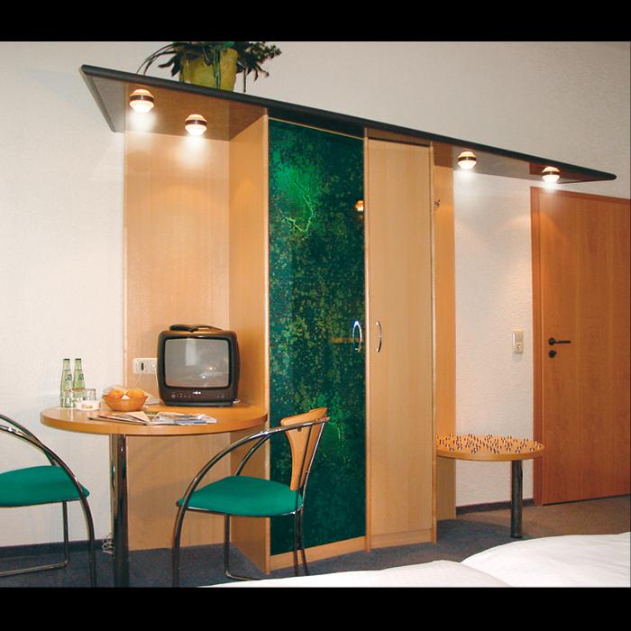 Referenzbeispiel für die Gestaltung der Einrichtung des City Hotels in Plauen. Das Hotel ist ein zentrumsnahes Geschäftshotel. Die modern und individuell ausgestatteten elf Einzel- und zehn Doppelzimmer, sowie einem Konferenzraum, bieten einen hohen Komfort. Darüber hinaus wurde eine phantasievolle Designer-Suite mit Whirlpool als Erlebnisbereich gestaltet.