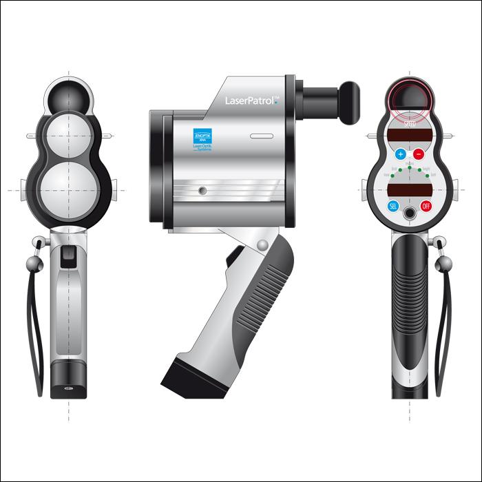 Die Laser Patrol der JENOPTIK Laser, Optik, Systeme GmbH ist ein Geschwindigkeitsmessgerät mit Systemcharakter. In 2 verschiedenen Baulängen und technischen Ausstattungen können die Geräte als Handversion oder auf Stativ genutzt werden. Der Handgriff lässt sich leicht für die Stativanwendung entfernen. Das Gehäuse ist sehr kostensparend aus 2 deckungsgleichen Aluminium Strangguss-Profilen zusammengesetzt, was dem Gerät eine außerordentliche Robustheit verleiht. Die Bedienung erfolgt über eine Folientastatur die stärksten Witterungseinflüssen stand hält.