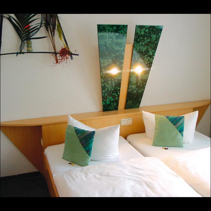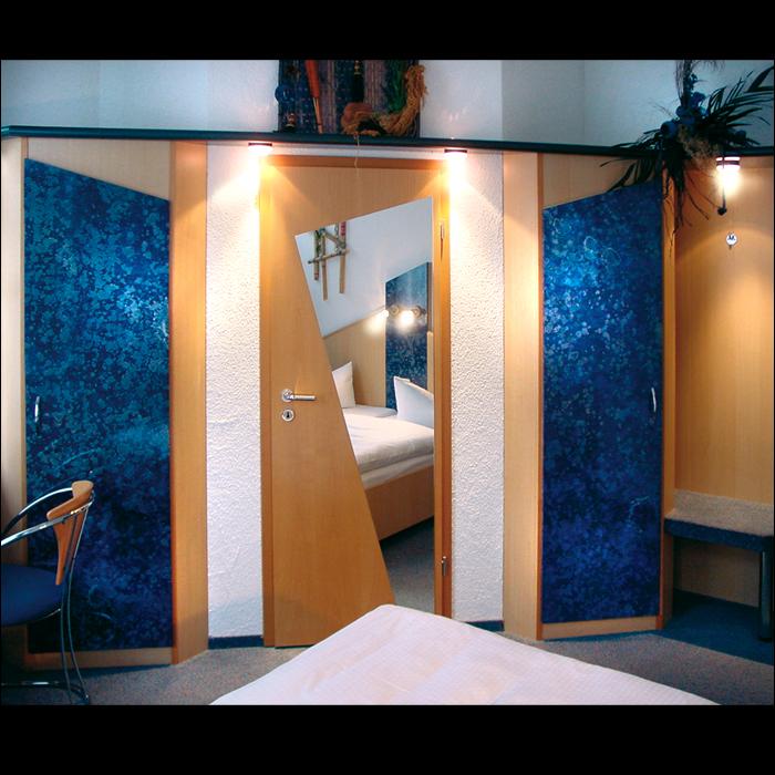 Referenzbeispiel für die Gestaltung der Einrichtung des City Hotels in Plauen. Das Hotel ist ein zentrumsnahes Geschäftshotel. Die modern und individuell ausgestatteten elf Einzel- und zehn Doppelzimmer, sowie einem Konferenzraum, bieten einen hohen Komfort. Darüber hinaus wurde eine phantasievolle Designer-Suite mit Whirlpool als Erlebnisbereich gestaltet.