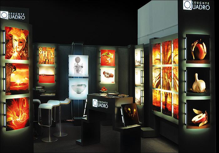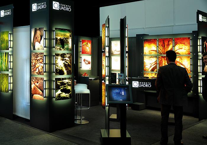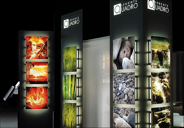Die Firma Werbetechnik Schmidt präsentiert Ihr Produkt Leuchte Quadro auf Messen für völlig unterschiedliche Märkte. Deshalb lag der Fokus bei der Gestaltung des Messestandes auf einer neutralen, in jedem Marktsegment einsetzbaren Optik, die zugleich das Produkt stilvoll und vordergründig in Szene setzt. Konstruktiv entstand ein leichtes, und leicht zu handhabendes Präsentationssystem mit Baukastencharakter für verschiedenste Grundrisse.